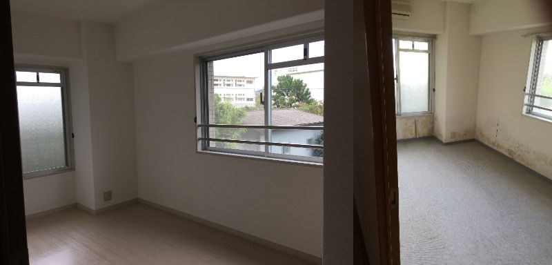 まくれ上がりカビだらけだったクロスを貼替、カーペットからクッションフロアへと張り替えるとお部屋は見違えるようにきれいになりました。く