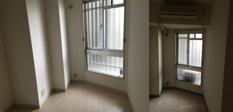 まくれ上がりカビだらけだったクロスを貼替、カーペットからクッションフロアへと張り替えるとお部屋は見違えるようにきれいになりました。く