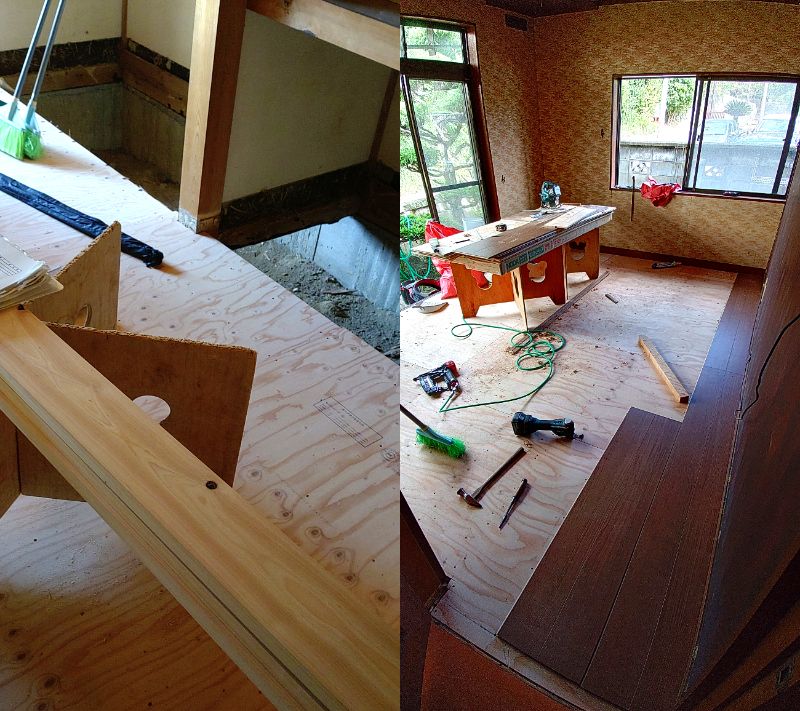 被害にあった床の改修中です。和室(押入)と洋室・縁側床の基礎・下地を強化しています。
